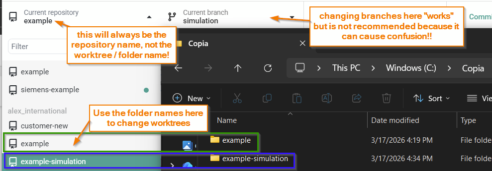 Note that the repository name will always remain 'example' in the upper left. However, both worktree folder names are now visible in the left dropdown. It is recommended you use this dropdown, not the branch dropdown, to change worktrees. Keep careful track - it's easy to get confused.